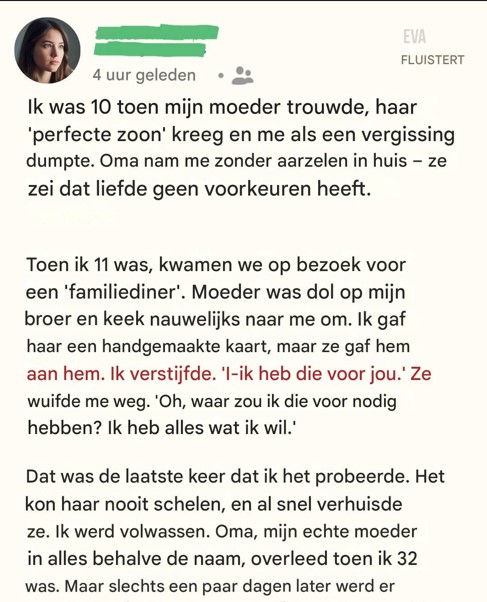 Ze noemde het een « nieuwe start ». Nieuwe echtgenoot. Nieuw huis. En kort daarna een babyjongetje. Haar perfecte zoon . Ik herinner me dat ik met mijn kleine koffer in de deuropening van dat lichte, onbekende huis stond en haar hem zag wiegen alsof de wereld haar eindelijk had gegeven wat ze wilde. Ze keek me nauwelijks aan.