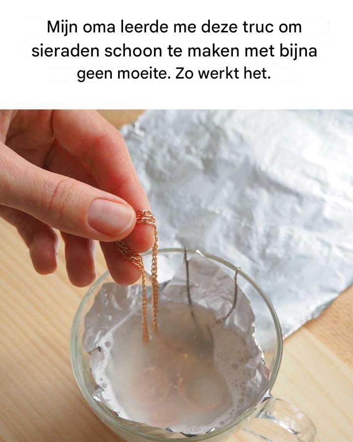 Het geheim van deze makkelijke schoonmaakmethode voor sieraden schuilt in een combinatie van gewone huishoudelijke middelen en een beetje wetenschap. De methode van mijn oma is eenvoudig, vereist minimale ingrediënten en werkt als magie op de meeste soorten sieraden, van goud en zilver tot diamanten en edelstenen.