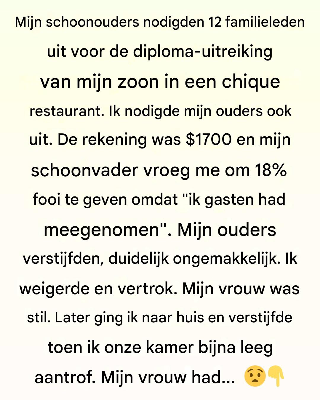 Mijn schoonouders hadden een groot diner gepland om het afstuderen van onze zoon op de middelbare school te vieren. Ze kozen voor een chique restaurant in het centrum – het soort met kroonluchters, linnen servetten en een menu zonder prijzen. Twaalf familieleden van mijn vrouw’s kant waren uitgenodigd, en toen ik voorstelde dat mijn ouders ook bij ons zouden komen – het was tenslotte de grote dag van hun kleinzoon – stemde mijn vrouw zonder aarzelen toe. Ik dacht dat het een heerlijke, familiale avond zou worden.
