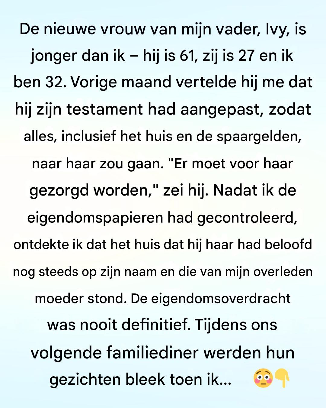 De nieuwe vrouw van mijn vader, Ivy, is jonger dan ik – hij is 61, zij is 27 en ik ben 32. Vorige maand vertelde hij me dat hij zijn testament had aangepast, zodat alles – het huis, het spaargeld, alles – naar haar zou gaan.