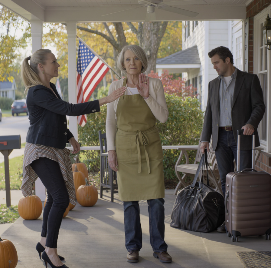 Toen ik naar de voorkant van mijn bescheiden huis met twee verdiepingen liep, vond ik mijn zoon op mijn veranda staan met zijn vrouw, Lennox, maar ze droegen niet de gebruikelijke tekenen van een informeel bezoek. Lennox had twee grote koffers naast zich, en Terrence haalde meer tassen uit de kofferbak.