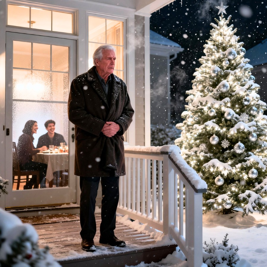 Ik stond op de veranda, met smeltende sneeuw op mijn schouders, en keek naar de vormen die achter het beslagen glas bewogen.