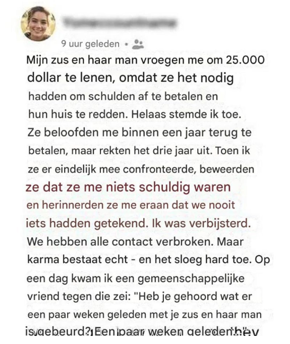 De volgende ochtend stond het geld op hun rekening. Lisa belde, huilend van opluchting, en bedankte me keer op keer. Een tijdje hield ik mezelf voor dat ik het juiste had gedaan. Dat dit was wat familie deed.