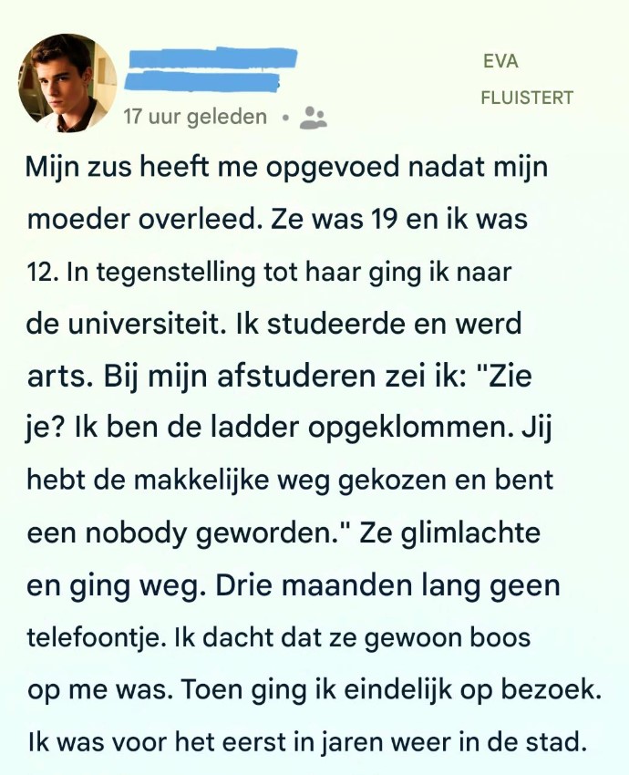 Ik herinner me nog steeds de geur van ontsmettingsmiddel in de gang van het ziekenhuis en hoe mijn zus zo rechtop stond tijdens de begrafenis, alsof ze haar verdriet fysiek kon bedwingen met alleen haar houding. Ze was negentien – zelf nauwelijks meer dan een meisje – en toch werd ze die dag mijn hele wereld.