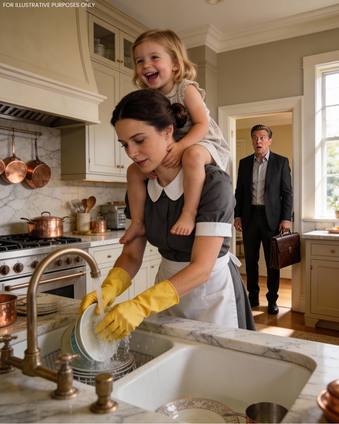 Op een stevige houten stoel zat Ava, haar kleine handjes ondergedompeld in zeepsop naast een jonge vrouw die Michael tijdens zijn gehaaste ochtenden nauwelijks opmerkte. Paige Collins, de nieuwe huishoudhulp, lachte zachtjes terwijl ze Ava’s vingers over een bord leidde.