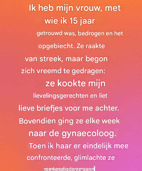 Na vijftien jaar huwelijk maakte ik de grootste fout van mijn leven – een fout die de vrouw die naast me had gestaan door elke storm had verbrijzeld. Ik heb mijn vrouw, Sarah, bedrogen. De affaire was maanden eerder geëindigd, maar het schuldgevoel niet. Elke glimlach van haar, elke aanraking, elk gedeeld diner was een stille herinnering dat ik in een leugen leefde.