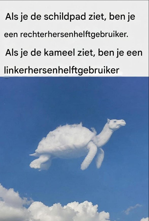 De afbeelding in kwestie is bedrieglijk eenvoudig: een wolkachtige vorm die op meerdere manieren geïnterpreteerd kan worden. Hoewel het abstract oogt, probeert je brein er snel betekenis aan te geven op basis van patronen die het al kent.