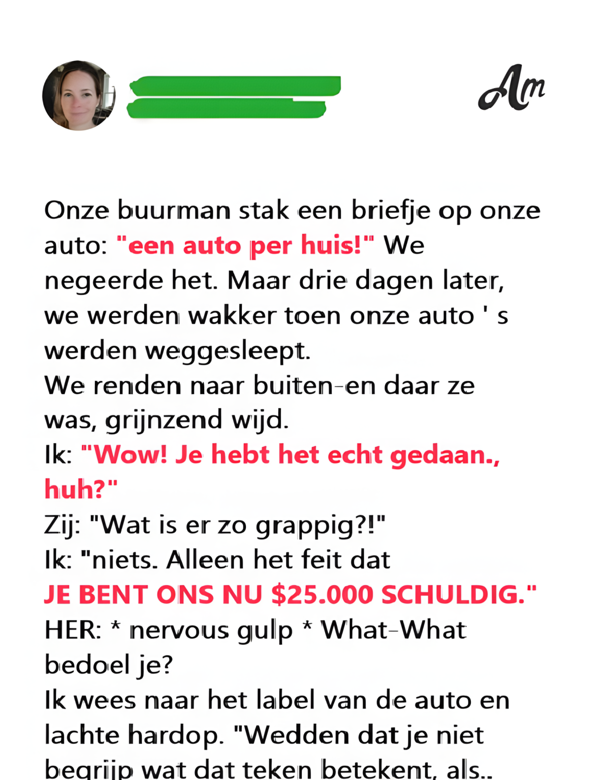 Ze glimlachte toen onze auto’s werden weggesleept, ervan overtuigd dat ze een of andere buurtruzie had gewonnen. Maar de volgende ochtend stond ze geschokt op haar veranda, geconfronteerd met een vergissing van $ 25.000 die ze nooit zou vergeten.
