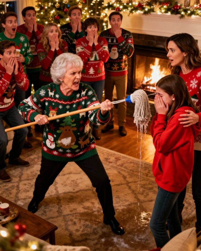 Op kerstavond duwde mijn moeder een druipende dweil in de handen van mijn achtjarige dochter, voor de ogen van vijfentwintig mensen, en zei: « Jullie eten hier gratis, dus wees nuttig »; wat volgde, deed iedereen verstijven van schrik…