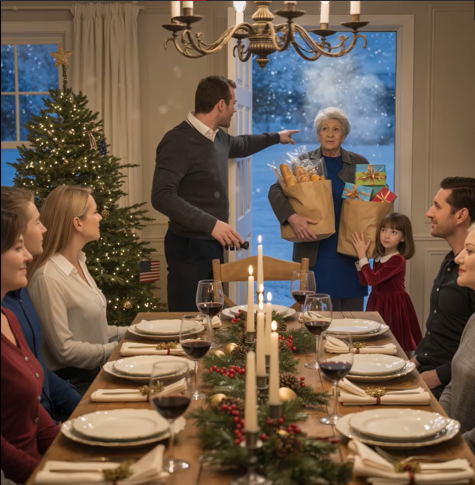 Sam opende het een seconde later. Hij glimlachte niet. Hij zei niet: « Vrolijk Kerstfeest. » Hij ging niet eens opzij. Hij staarde alleen maar naar de tassen in mijn handen alsof het afval was dat ik naar het verkeerde adres had gebracht.