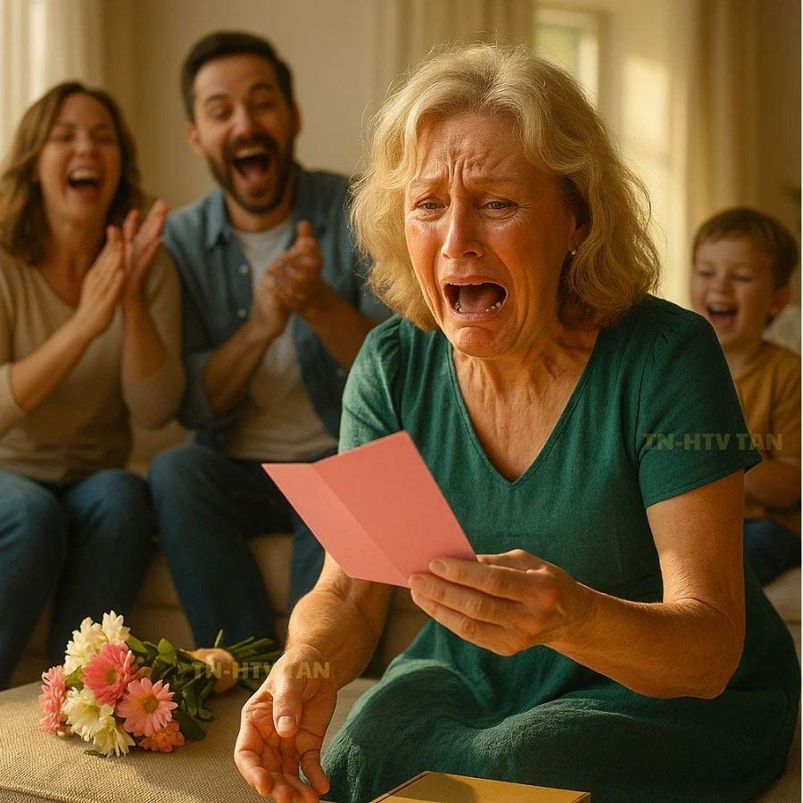 Ik zat op de bank, omringd door mijn familie. Sarah haalde een roze briefje uit haar tas en gaf het aan me. « Dit is van ons allemaal, mam. Lees het hardop voor, zodat iedereen het kan horen. »