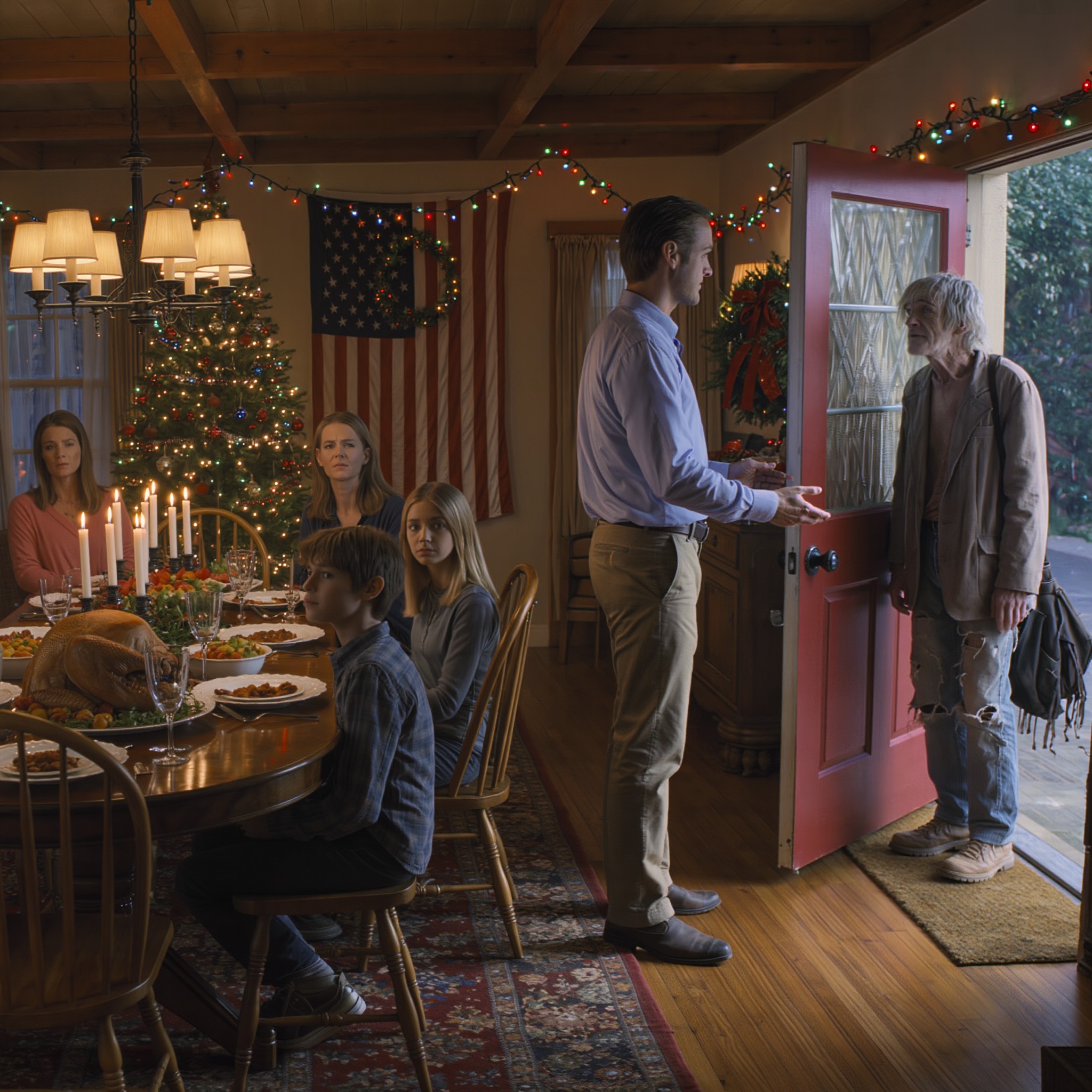 Lauren Mitchell, 17, was de tafel aan het dekken voor Thanksgiving toen een dakloze man aanklopte en om eten vroeg. Haar moeder zei nee. Lauren stemde toe – dit was hun familiediner. Maar haar vader, Rob, stond erop: « Dek een andere tafel. » Met tegenzin lieten ze David Anderson aanschuiven. Het diner verliep ongemakkelijk totdat David iets zei waar Rob van verstijfde.