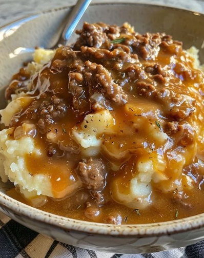 proefde dit heerlijke gerecht voor het eerst tijdens een gemeenschapsbijeenkomst. Potlucks kunnen een allegaartje zijn, waarbij je sommige gerechten beleefd probeert en andere waar je graag naar terugkeert. Het gerecht met gehakt en jus boven aardappelpuree was een grote hit, zowel voor mij als voor mijn man. We vonden het allebei erg lekker, dus ik moest om het recept vragen. Het waren niet alleen wij, maar ook anderen. Alle gasten vonden het heerlijk en wilden het recept kennen en de bijzondere ingrediënten ontdekken. Lekker, heerlijk en bevredigend – iedereen wilde er deel van uitmaken.