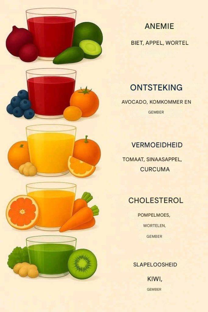 Kunnen deze sappen deze aandoeningen echt verlichten? De vetgedrukte combinaties op de afbeelding suggereren voordelen, maar de wetenschap suggereert dat ze eerder ondersteuning bieden dan een snelle oplossing. Biet kan helpen met ijzer, gember bij ontstekingen en kiwi bij slapeloosheid, maar significante veranderingen kosten tijd en vereisen mogelijk medisch toezicht. De aantrekkingskracht zit in de geleidelijke verbetering die ze kunnen brengen, wat je aanmoedigt om voorzichtig te experimenteren.