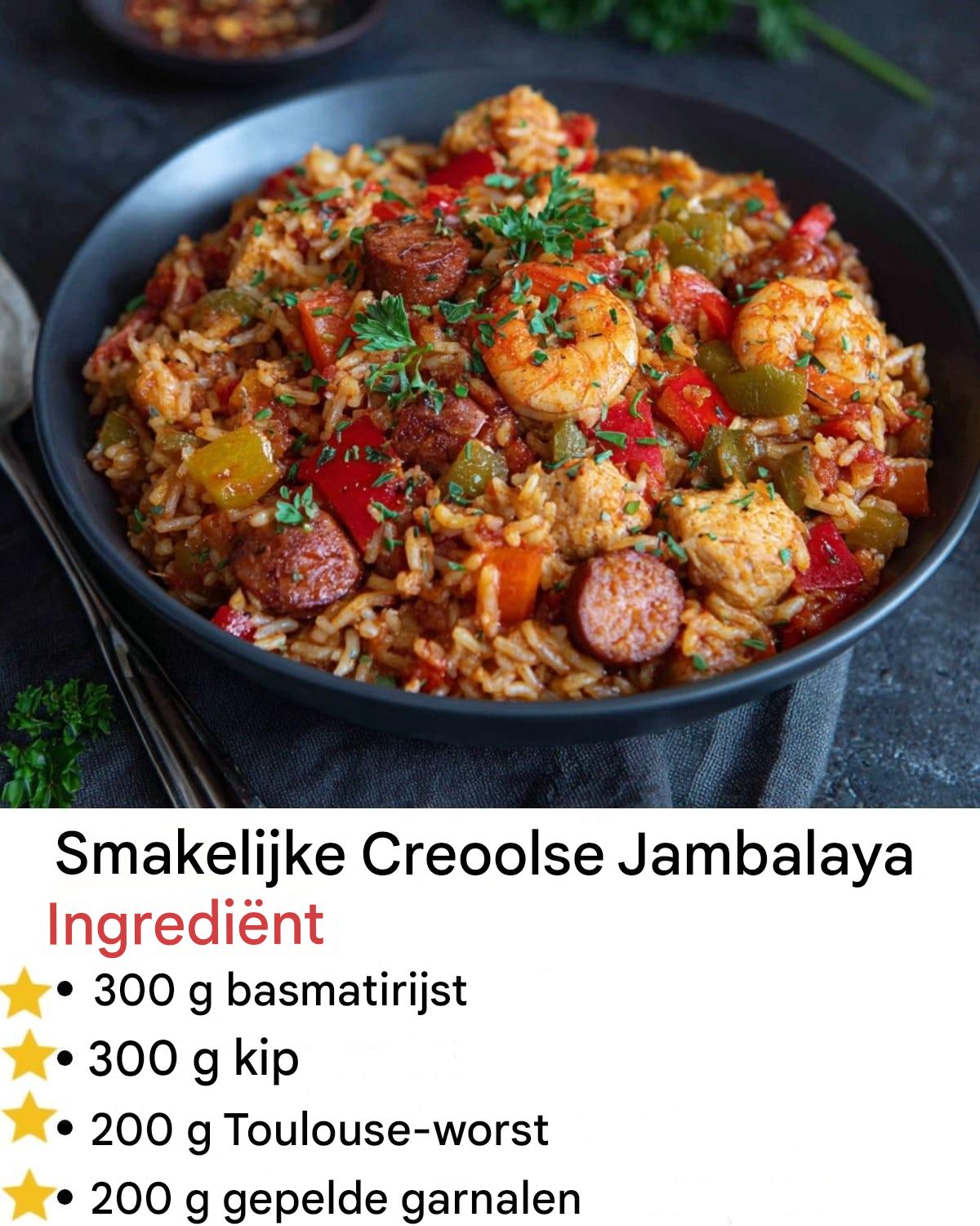 Hartige Creoolse Jambalaya is een iconisch gerecht uit Louisiana, een symbool van de fusie van Franse, Spaanse, Afrikaanse en Caribische culturen. Dit kleurrijke en hartige gerecht combineert rijst, kip, garnalen, gerookte worst en diverse kruiden die het zijn unieke en verwarmende smaak geven. Het is een complete, gezellige en karaktervolle maaltijd, perfect voor grote bijeenkomsten of feestelijke gelegenheden.