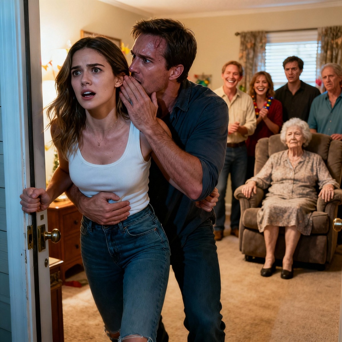 Terwijl de familie de 85e verjaardag van mijn grootmoeder vierde, leunde mijn man plotseling naar mijn oor en fluisterde: « Pak je tas. We gaan weg. Vraag niets, doe niets vreemds. » Ik dacht dat hij overdreef… totdat we bij de auto aankwamen en hij de deuren op slot deed, zijn stem trillend: « Er is iets heel erg mis in dat huis. » Tien minuten later belde ik de politie – en wat ze ontdekten bracht mijn hele familie in paniek.