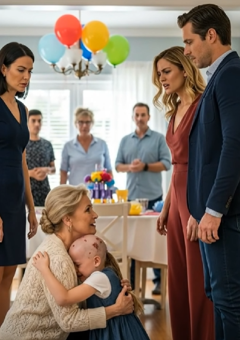Mijn naam is Emily. Ik ben eenenzeventig jaar oud en ik had nooit gedacht dat ik op mijn leeftijd zoiets vreselijks zou moeten meemaken als wat ik je nu ga vertellen. Toen ik mijn zesjarige kleindochter zag met haar prachtige, volledig geschoren hoofd, voelde ik me alsof de wereld onder mijn voeten instortte. Haar gouden haar was volledig verdwenen. Alles wat overbleef was haar kleine hoofdhuidje, bloot en kwetsbaar, alsof het was overreden door een industrieel scheermes. Mijn hart stond volledig stil.