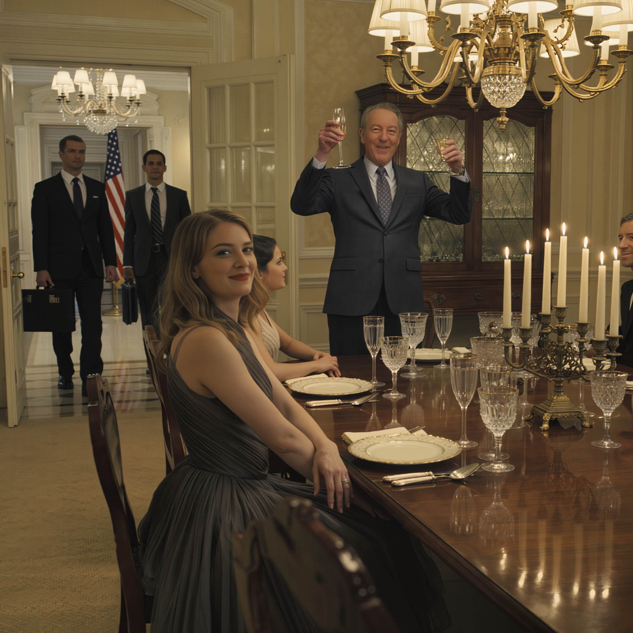 En toen draaide hij langzaam en doelbewust zijn hoofd om. Zijn blik gleed over de hele lengte van de tafel, zo’n zes meter lang, langs de glimmende kalkoen, langs de kristallen wijnglazen, en bleef op mij rusten. De glimlach was verdwenen. Zijn gezicht verstrakte en veranderde in het koude granieten masker van de man die me tien jaar geleden had verbannen. De kamer werd weer stil, de verandering voelend. Dit was het, het hoogtepunt.