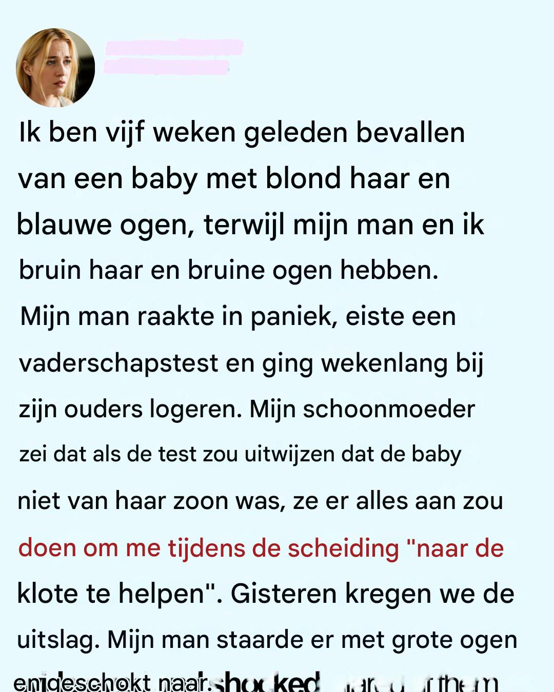 Onze dochter werd geboren met felblond haar en blauwe ogen—kenmerken die noch mijn man noch ik hebben. Het contrast maakte hem kapot, en in plaats van met mij te praten, liet hij zijn angst spiralen.