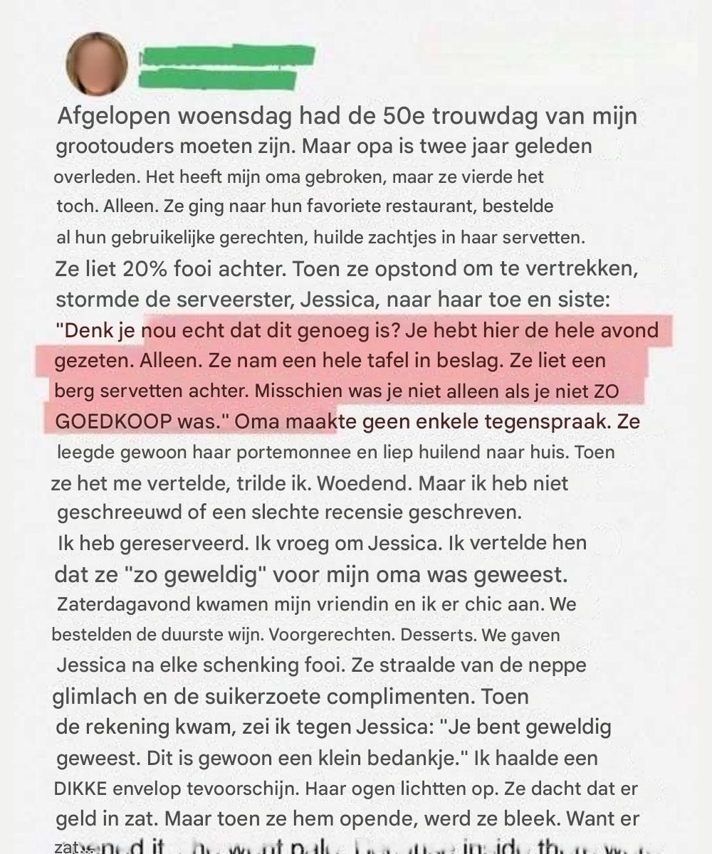 Haar budget was krap. Ze telde zorgvuldig wat ze had en zette net genoeg opzij voor het buskaartje en hun « gebruikelijke » bestelling – dezelfde maaltijd die zij en opa elk jaar deelden.