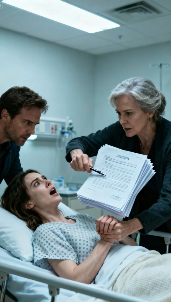 Toen ik zes maanden zwanger was, werd ik van de trap geduwd. Toen ik wakker werd in het ziekenhuis, duwde mijn schoonmoeder me een papier toe: « Je hebt gefaald als moeder. Teken dit – je gaat naar een psychiatrische inrichting. » Mijn man bleef stil terwijl ik trilde, met een pen in de hand. Toen vloog de deur open. De stem van de hoofdarts sneed door de spanning heen: « Stop. De politie heeft het ziekenhuis omsingeld. » Eén ding wisten ze niet: elk detail was onderdeel geweest van mijn val.