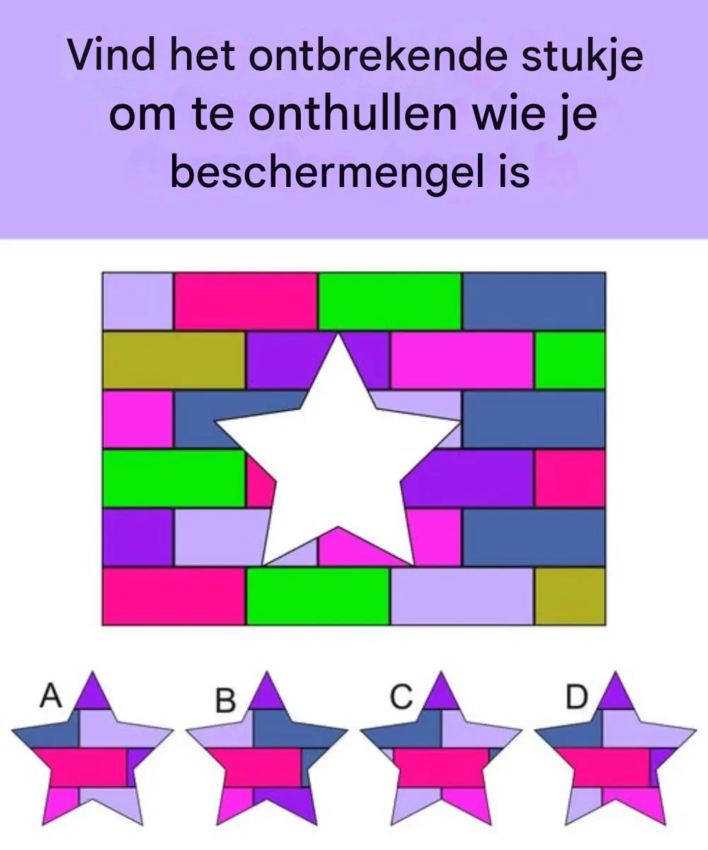 In deze visuele puzzel word je uitgenodigd om te ontdekken welk type beschermengel het beste bij jouw persoonlijkheid en levenspad past. Het ontwerp toont een kleurrijke mozaïek met een ontbrekende stervorm in het midden. Hieronder zie je vier mogelijke stervormige stukjes. De uitdaging is simpel: kies het sterstuk dat bij je past. De beslissing die je neemt – zelfs als je die snel of intuïtief kiest – kan iets onthullen over de kwaliteiten die je zoekt of de begeleiding die bij je past.