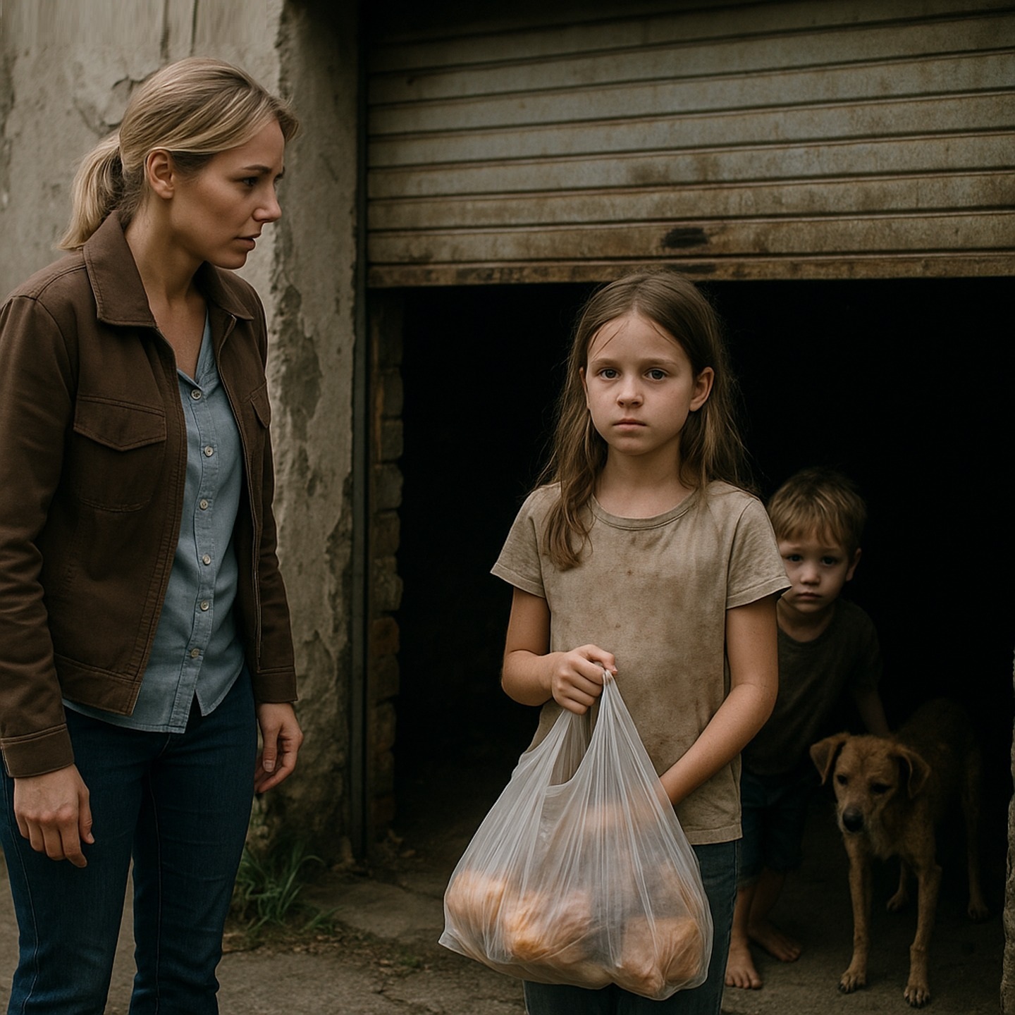 Op dat moment ging de garagedeur krakend open. Twee kleine figuurtjes kwamen tevoorschijn: een jongetje, nog jonger dan het meisje, en een tenger uitziende hond.
