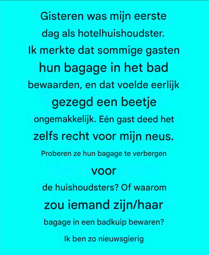 Maar terwijl ik van kamer naar kamer liep, begon me iets vreemds op te vallen. Gasten – zakenmensen, gezinnen, zelfs individuele reizigers – zetten allemaal hun koffers in het bad.