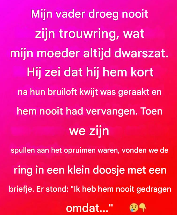 Toen we na het overlijden van mijn vader zijn spullen gingen uitzoeken, verwachtten we niet meer dan de gebruikelijke snuisterijen – oude jassen, versleten gereedschap, verbleekte bonnetjes. In plaats daarvan vonden we een klein doosje dat ons beeld van hem volledig veranderde. Daarin lag zijn trouwring, zorgvuldig verpakt in een zachte doek, samen met een handgeschreven briefje dat begon met: ‘Ik droeg hem niet omdat…’