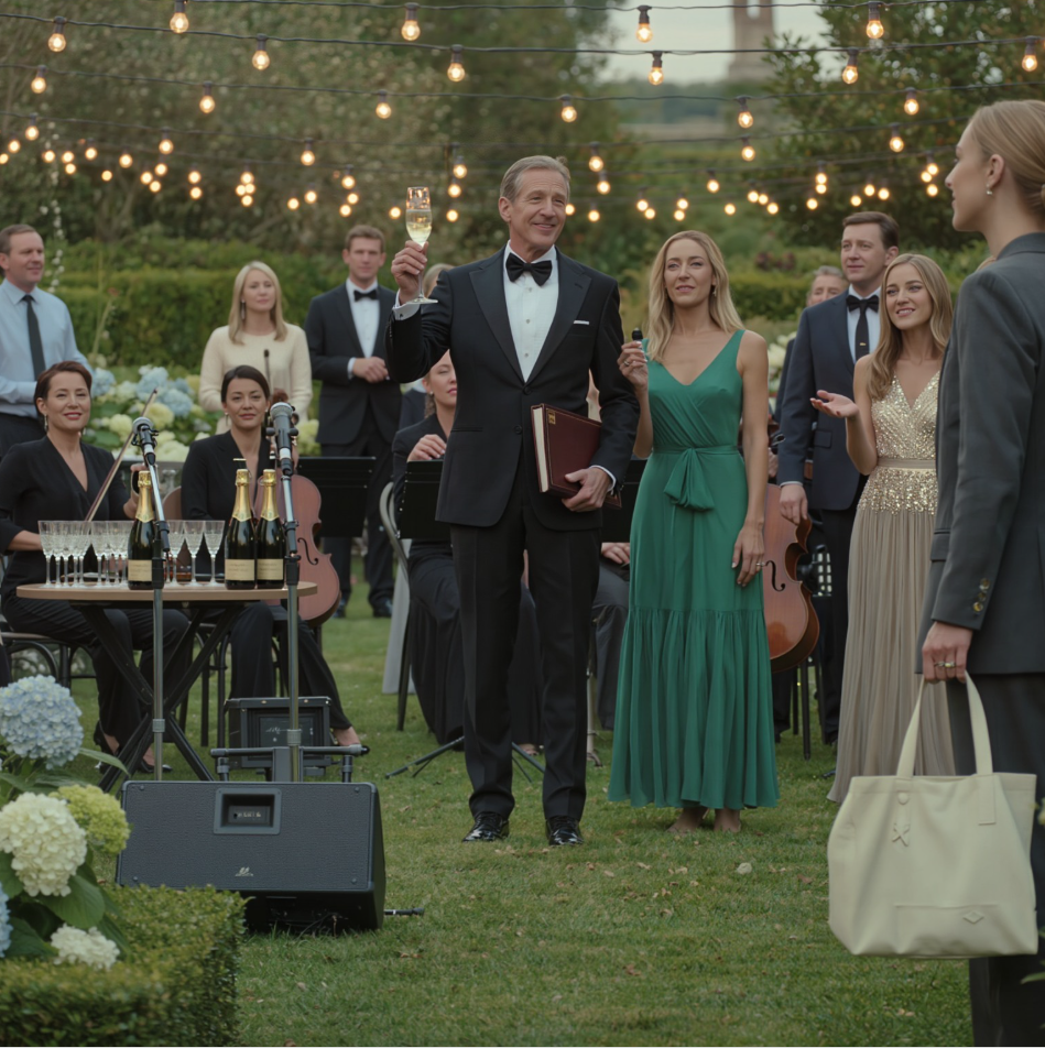Ze hebben iedereen naar buiten in de tuin gezet. De muziek stopte abrupt. Mijn vader, William Blackwood, stapte het midden van het veld in. Hij sloeg met een lepel op zijn glas. Er is stilte gevallen.