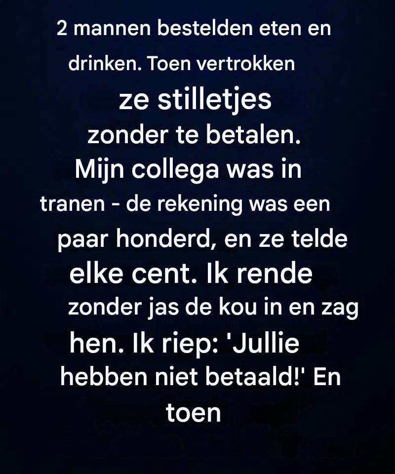 Dat is precies wat er gebeurde op een koude avond in ons kleine café toen twee mannen naar buiten liepen zonder hun rekening te betalen. In eerste instantie leek het niets meer dan een ander geval van mensen die probeerden te profiteren. Maar de waarheid was veel gecompliceerder – en veel menselijker.