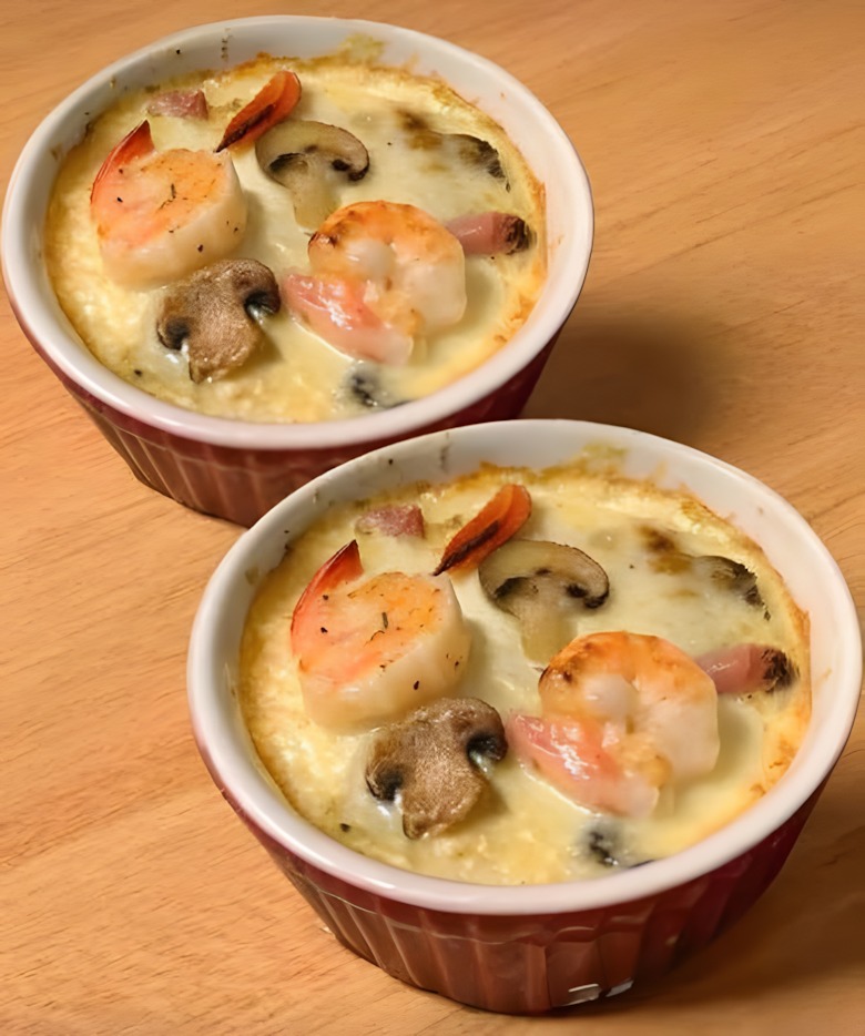 De zachte, zoete smaak van Sint-jakobsschelpen ontmoet de sappigheid van garnalen en de aardse toets van champignons — samen vormen ze een harmonieus geheel dat even luxueus als eenvoudig te bereiden is.