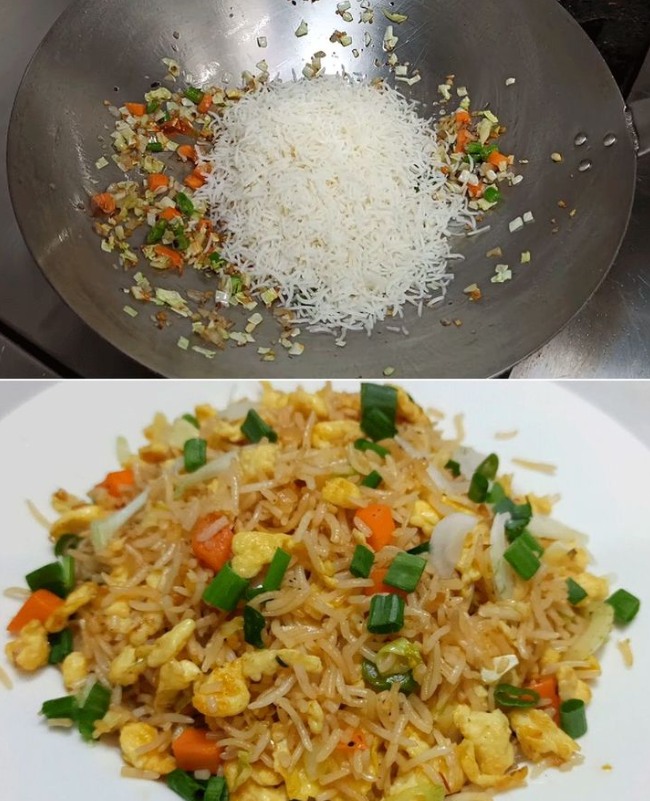 Begin met het toevoegen van de sojasaus, meng een beetje en voeg de al gekookte witte rijst toe.